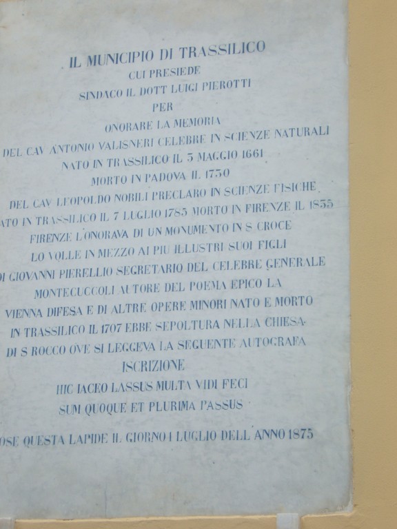 La lapide che il Municipio di Trassilico pose nell'anno 1875 sulla facciata della Chiesa di S. Rocco per ricordare i suoi illustri figli. Primi fra tutti il "Cav. Antonio Vallisneri"